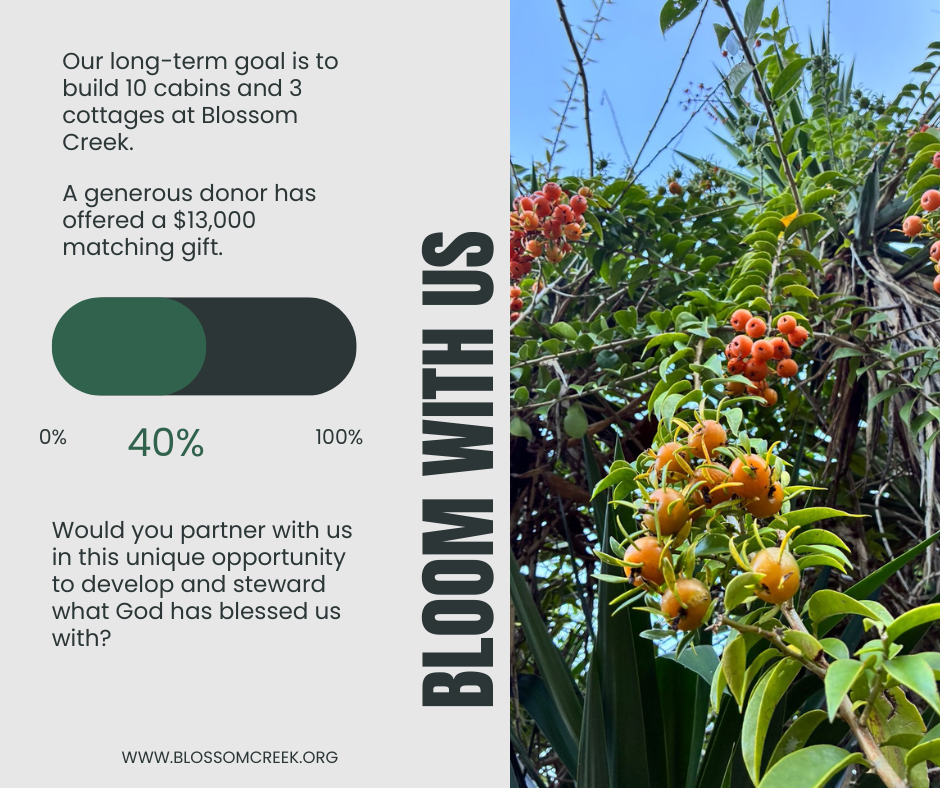 Blossom Creek Farm started with a simple vision: To cultivate in people a deep and intimate love for Jesus. This lead us to a space where people can connect with nature, learn about coffee, and rejuvenate their souls as they lean into Jesus. With our camping cabins, educational programs, organic farming practices, and tranquil retreats, we have been able to bring that vision to life.